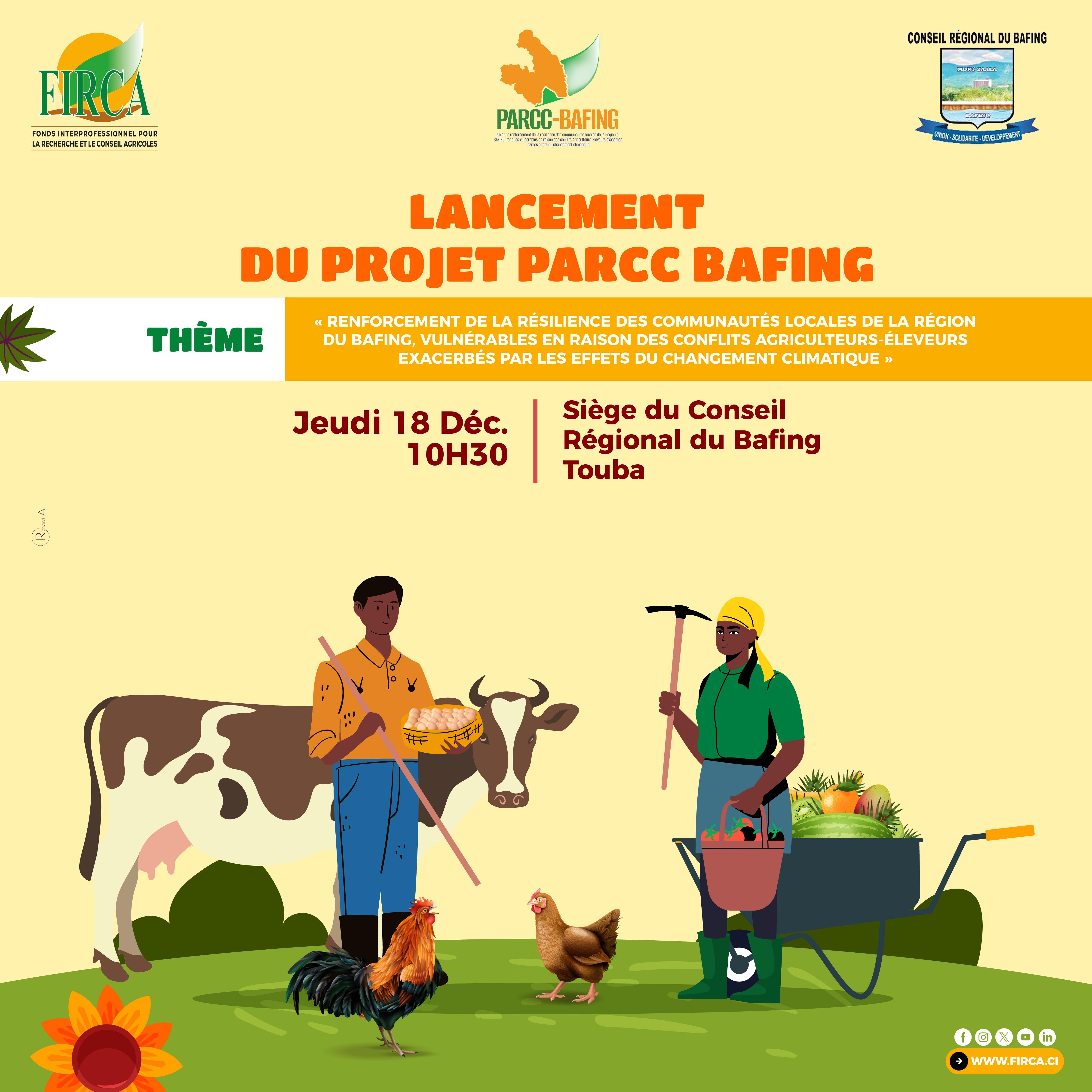 🌍 Lancement officiel du projet PARCC Bafing 🌱 Le FIRCA, en partenariat avec le Conseil Régional du Bafing, annonce le lancement officiel du Projet PARCC Bafing (Projet de Renforcement de la Résilience des Communautés du Bafing). 🎯 Thème : «Renforcement de la résilience des communautés locales de la région du Bafing, vulnérables en raison des conflits agriculteurs–éleveurs exacerbés par les effets du changement climatique» 📅 Jeudi 18 décembre ⏰ 10h30 📍 Siège du Conseil Régional du Bafing – Touba Ce projet ambitieux vise à renforcer l’adaptation climatique, promouvoir la cohésion sociale et soutenir un développement agricole durable au bénéfice des communautés locales. 👉 Rendez-vous le 18 décembre pour le lancement officiel. #LeFIRCA #PARCCBafing #AdaptationClimatique #CohésionSociale