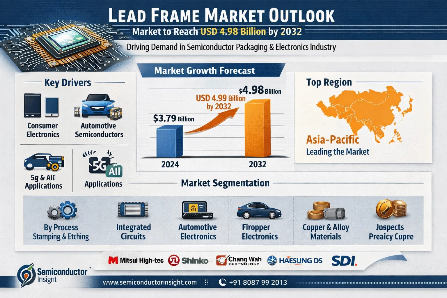 Lead Frame Market to Reach USD 4.98 Billion by 2032 | Growing Demand from Semiconductor Packaging & Electronics Industry The global Lead Frame Market, valued at a robust USD 3.79 billion in 2024, is on a steady growth trajectory, projected to reach USD 4.98 billion by 2032. This expansion, representing a compound annual growth rate (CAGR) of 4.1%, is detailed in a comprehensive new report published by Semiconductor Insight. The study underscores the indispensable role of these critical components in semiconductor packaging, highlighting their function as the foundational metal structures that provide mechanical support, electrical connectivity, and heat dissipation for integrated circuits and discrete devices. Lead frames, the metallic skeletons upon which semiconductor dies are mounted and connected, are paramount to the performance and longevity of virtually all electronic devices. Their design directly influences factors such as signal integrity, thermal management, and overall package form factor. As semiconductor technology continues its relentless march towards miniaturization and higher performance, the demand for advanced lead frames with finer pitches and enhanced materials is intensifying. Download FREE Sample Report: Lead Frame Market - View in Detailed Research Report Proliferation of Electronics and Automotive Semiconductor Demand: Primary Growth Engines The report identifies the ubiquitous expansion of the global electronics sector as the paramount driver for lead frame demand. The correlation is direct and substantial, with the integrated circuit application segment constituting the largest downstream application for lead frames. The consumer electronics segment, in particular, creates a massive and consistent demand for lead frames, driven by relentless innovation and high-volume production cycles for smartphones, laptops, and wearables. "The Asia-Pacific region is the undisputed epicenter of the global lead frame market, accounting for a dominant share of both production and consumption," the report states. This concentration is fueled by the region's unparalleled electronics manufacturing ecosystem, which encompasses everything from semiconductor fabrication and assembly to final product assembly. With extensive supply chains for key raw materials like copper alloy and a highly skilled workforce, Asia-Pacific producers are exceptionally well-positioned to meet the evolving demands of the global semiconductor industry, particularly as packaging technologies advance to support devices for 5G, AI, and automotive applications. Read Full Report: https://semiconductorinsight.com/report/lead-frame-market/ Market Segmentation: Stamping Process and Integrated Circuit Applications Dominate The report provides a detailed segmentation analysis, offering a clear view of the market structure and key growth segments: Segment Analysis: By Process Stamping Process Leadframe Etching Process Leadframe By Application Integrated Circuit Discrete Device Others By End User Consumer Electronics Automotive Industry Industrial & Telecommunication By Material Copper Alloy Alloy 42 Other Specialty Alloys Download Sample Report: https://semiconductorinsight.com/download-sample-report/?product_id=127113 Competitive Landscape: Key Players and Strategic Focus The report profiles key industry players, including: Mitsui High-tec (Japan) Shinko Electric Industries Co., Ltd. (Japan) Chang Wah Technology Co., Ltd. (Taiwan) Advanced Assembly Materials International Ltd. (AAMI) (Hong Kong) HAESUNG DS Co., Ltd. (South Korea) SDI (South Korea) Fusheng Electronics (Taiwan) Enomoto Co., Ltd. (Japan) Kangqiang Electronics (China) POSSEHL (Germany) JIH LIN TECHNOLOGY CO., LTD. (Taiwan) Jentech Precision Industrial Co., Ltd. (Taiwan) Hualong (China) Dynacraft Industries (India) QPL Limited (Hong Kong) These companies are focusing on technological advancements, such as developing lead frames for advanced packaging like QFN and QFP, and expanding production capacity in high-growth regions like Southeast Asia to capitalize on the shifting global supply chain and increasing demand. Emerging Opportunities in Advanced Packaging and Automotive Electrification Beyond traditional consumer electronics drivers, the report outlines significant emerging opportunities. The rapid expansion of electric vehicle (EV) production and the integration of advanced driver-assistance systems (ADAS) present substantial new growth avenues, requiring high-reliability lead frames for power semiconductors and sensors. The transition to more complex semiconductor packages for high-performance computing and 5G infrastructure, which demand lead frames with superior electrical and thermal characteristics, represents another key trend. The ongoing industry-wide push for supply chain resilience and localized manufacturing is also prompting strategic investments and partnerships within the lead frame sector, creating new competitive dynamics. Report Scope and Availability The market research report offers a comprehensive analysis of the global and regional Lead Frame markets from 2025–2032. It provides detailed segmentation, market size forecasts, competitive intelligence, technology trends, and an evaluation of key market dynamics. For a detailed analysis of market drivers, restraints, opportunities, and the competitive strategies of key players, access the complete report. Read Full Report: https://semiconductorinsight.com/report/lead-frame-market/ Download Sample Report: https://semiconductorinsight.com/download-sample-report/?product_id=127113 Get Full Report Here: Lead Frame Market, Global Business Strategies 2025-2032 - View in Detailed Research Report About Semiconductor Insight Semiconductor Insight is a leading provider of market intelligence and strategic consulting for the global semiconductor and high-technology industries. Our in-depth reports and analysis offer actionable insights to help businesses navigate complex market dynamics, id