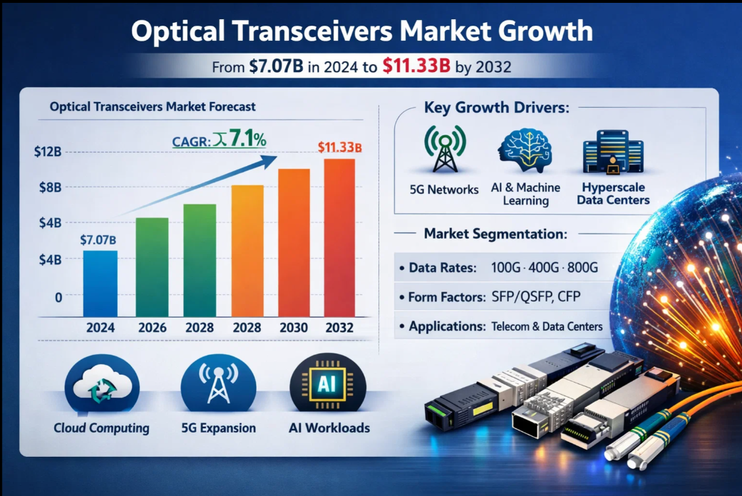 • Optical Transceivers Market Growth to $11.33B by 2032 Powered by 5G, AI Workloads and Data Centers