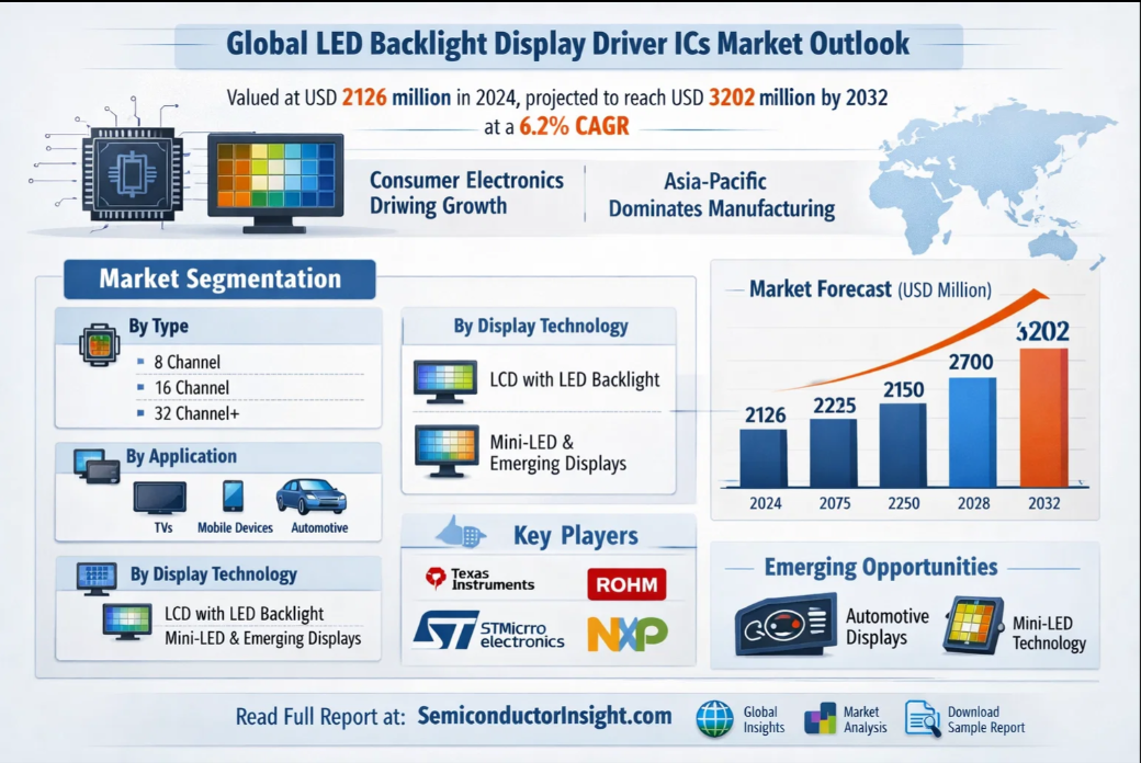#LEDBacklightDriverIC #DisplayDriverIC #SemiconductorMarket #DisplayTechnology #MiniLED #ConsumerElectronics #AutomotiveDisplays #AutomotiveElectronics #SemiconductorIndustry #ElectronicsIndustry #TechMarketGrowth #MarketResearch #ICDesign #DisplayInnovation #SmartDisplays #ElectronicsManufacturing #GlobalMarket #TechnologyTrends #SemiconductorInsight